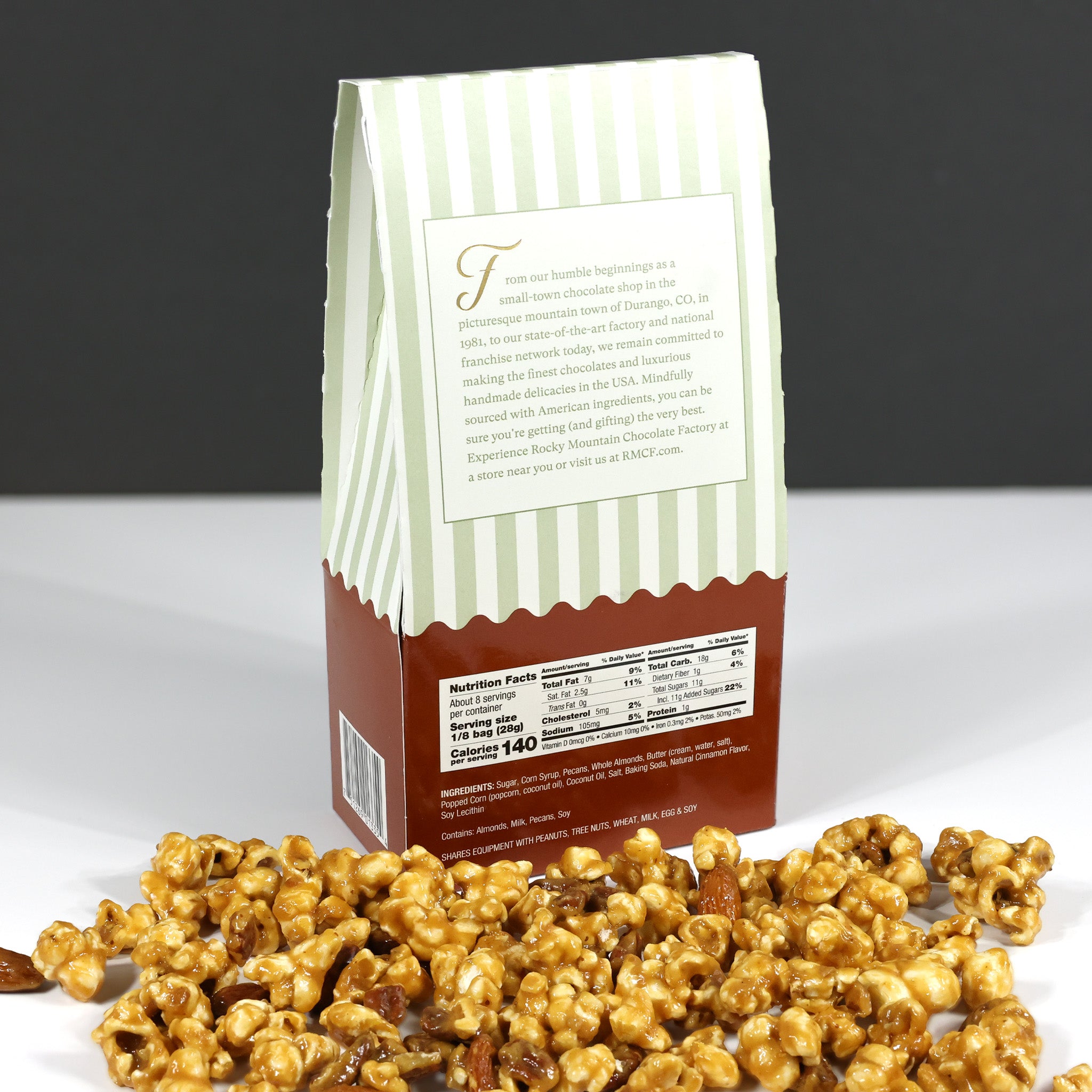Freshly popped, airy popcorn, coat it in a luscious layer of rich, buttery caramel, and finish with a generous sprinkling of freshly roasted pecans, almonds and cinnamon. The result? A decadent blend of crunch, sweetness, and nutty perfection that turns every bite into a luxurious experience.